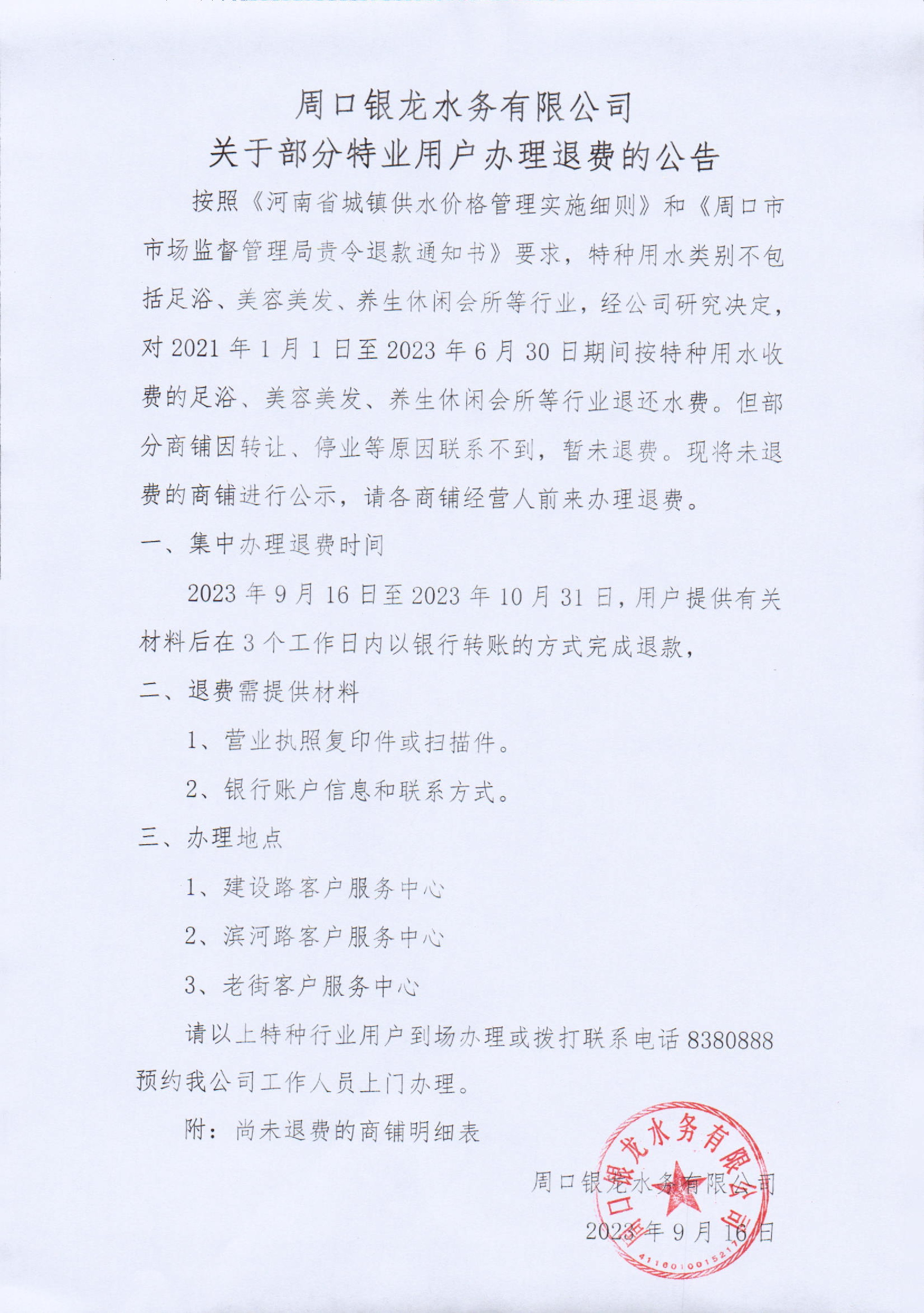 周口銀龍水務(wù)有限公司關(guān)于部分特業(yè)用戶辦理退費(fèi)的公告按照《河南省城鎮(zhèn)供水價(jià)格管理實(shí)施細(xì)則》和《周口市市場(chǎng)監(jiān)督管理局責(zé)令退款通知書》要求,特種用水類別不包括足浴、美容美發(fā)、養(yǎng)生休閑會(huì)所等行業(yè),經(jīng)公司研究決定...